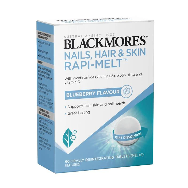 Blackmores Nails, Hair & Skin Rapi-Melt contains vitamin C, biotin, nicotinamide (vitamin B3) and silica and is a great tasting blueberry flavoured melt in a convenient two-a-day dose, supporting on-the-go wellness.